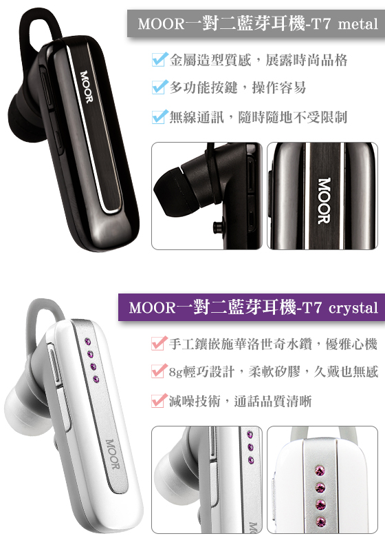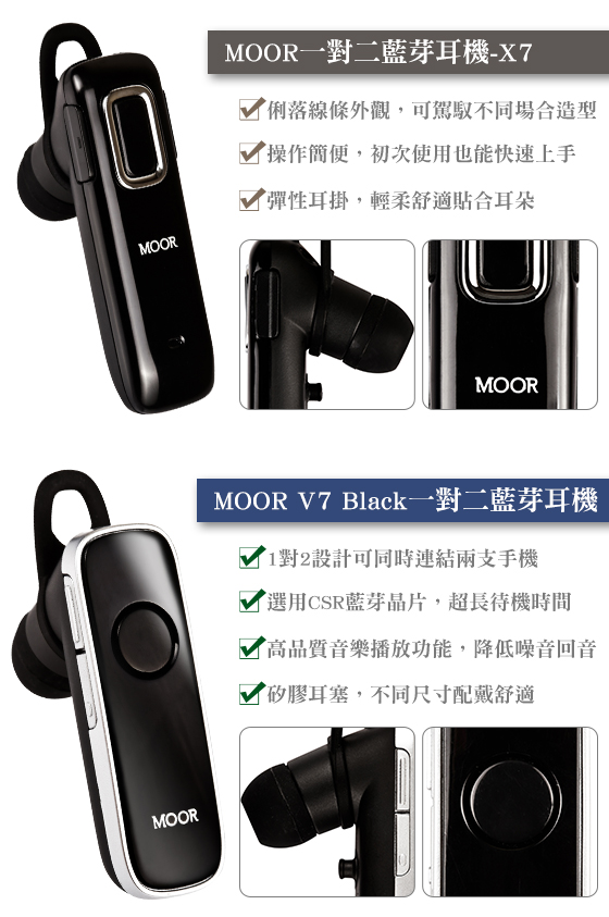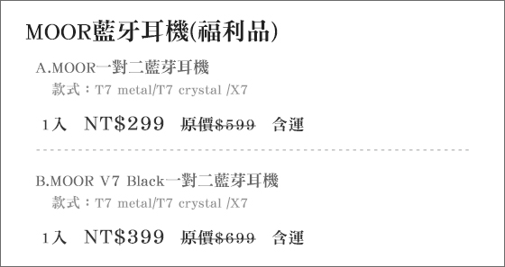 商品訊息簡述: 只要299元起(含運)即可購得原價最高699元藍芽耳機系列任選1入:(A)MOOR一對二藍芽耳機(福利品)/(B)MOOR V7 Black一對二藍芽耳機(福利品)。