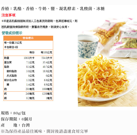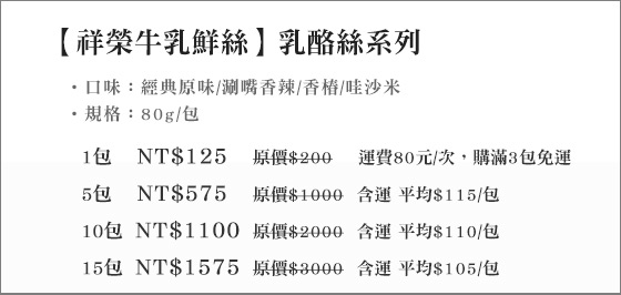 商品訊息簡述: 平均每包最低只要105元起(3包免運)即可購得【祥榮牛乳鮮絲】乳酪絲系列1包/5包/10包/15包(80g/包),口味:經典原味/涮嘴香辣/香椿/哇沙米。